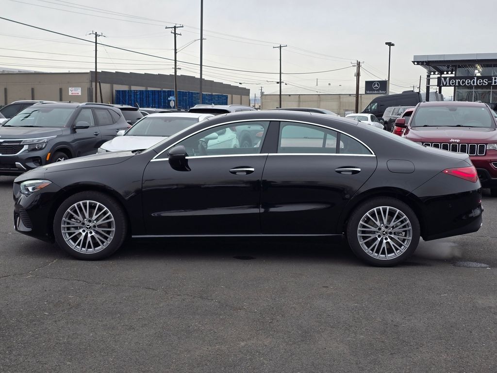 Black 2025 Mercedes-Benz CLA CLA 250 4MATIC® 2.0L I4 Turbocharged 8 Speed Dual Clutch 4MATIC® 4D Coupe 18" Multi-Spoke Alloy Wheels, 4-Wheel Disc Brakes, 8 Speakers, 8-Way Power Adjustable Driver and Passenger Seats, ABS brakes, Air Conditioning, Alloy wheels, AM/FM radio: SiriusXM, Apple CarPlay®/Android Auto®, Auto High-beam Headlights, Auto-dimming Rear-View mirror, Automatic temperature control, Brake assist, Brushed Aluminum Interior Trim, Bumpers: body-color, Child-Seat-Sensing Airbag, Delay-off headlights, Driver door bin, Driver vanity mirror, Dual front impact airbags, Dual front side impact airbags, Electronic Stability Control, Emergency communication system: eCall Emergency System, Exterior Parking Camera Rear, Four wheel independent suspension, Front anti-roll bar, Front Bucket Seats, Front Center Armrest, Front dual zone A/C, Front reading lights, Fully automatic headlights, Garage door transmitter, Heated door mirrors, Illuminated entry, Knee airbag, Leather steering wheel, Low tire pressure warning, MB-Tex Upholstery, Memory seat, Occupant sensing airbag, Outside temperature display, Overhead airbag, Overhead console, Panic alarm, Passenger door bin, Passenger vanity mirror, Power door mirrors, Power driver seat, Power moonroof, Power passenger seat, Power steering, Power windows, Radio data system, Radio: MBUX Multimedia System, Rain sensing wipers, Rear anti-roll bar, Rear fog lights, Rear reading lights, Rear seat center armrest, Rear window defroster, Remote keyless entry, Security system, SiriusXM Satellite Radio, Speed control, Speed-sensing steering, Split folding rear seat, Steering wheel mounted audio controls, Tachometer, Telescoping steering wheel, Tilt steering wheel, Traction control, Trip computer, Turn signal indicator mirrors, Variably intermittent wipers.