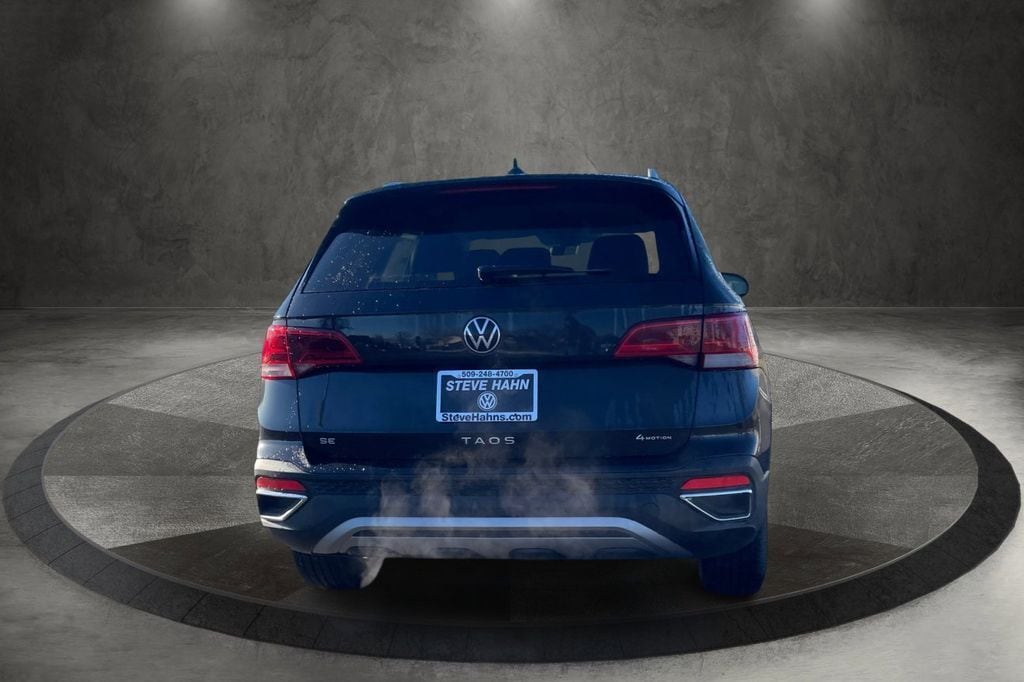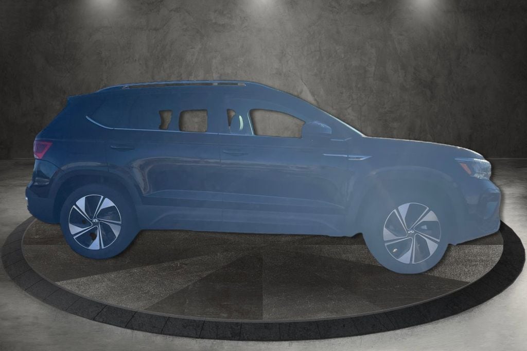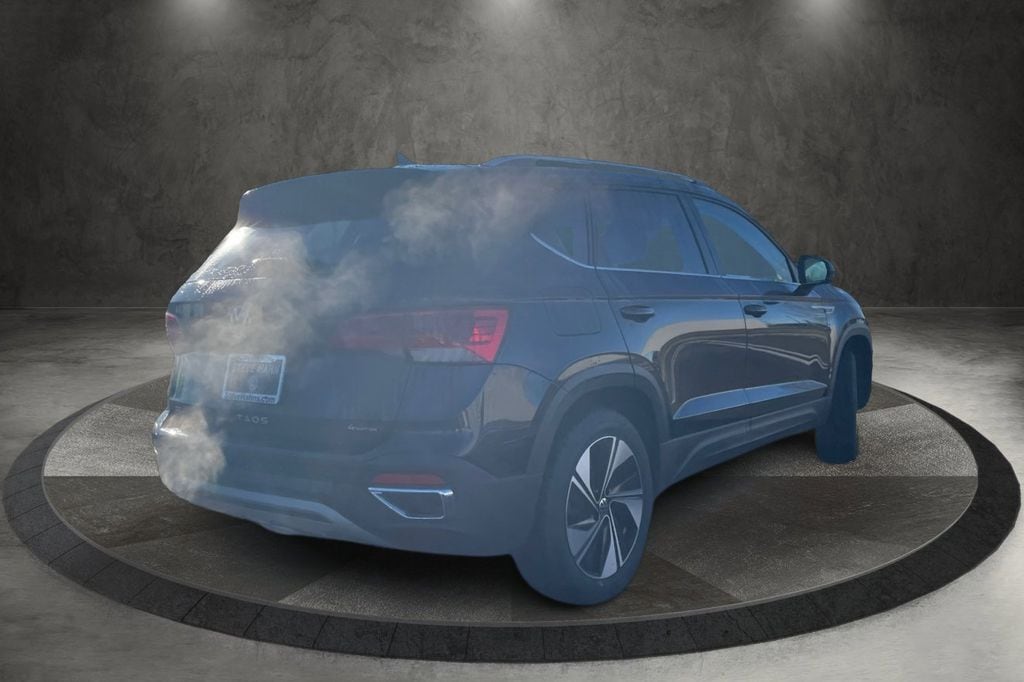 Deep Black 2024 Volkswagen Taos 1.5T SE 1.5L I4 Turbocharged DOHC 16V LEV3-SULEV30 158hp 7-Speed DSG Automatic with Tiptronic AWD 4D Sport Utility 4-Wheel Disc Brakes, 5.20 Axle Ratio, 6 Speakers, ABS brakes, Active Blind Spot Monitor, Air Conditioning, Alloy wheels, AM/FM radio: SiriusXM with 360L, Auto High-beam Headlights, Automatic temperature control, Brake assist, Bumpers: body-color, CloudTex & Cloth Seating Surfaces, Compass, Delay-off headlights, Driver door bin, Driver vanity mirror, Dual front impact airbags, Dual front side impact airbags, Electronic Stability Control, Emergency communication system: VW Car-Net Safe & Secure 5-year, Exterior Parking Camera Rear, Four wheel independent suspension, Front anti-roll bar, Front Bucket Seats, Front Center Armrest, Front dual zone A/C, Front reading lights, Front Strut Rear Multi-Link Suspension, Fully automatic headlights, Heated door mirrors, Heated Front Bucket Seats, Heated front seats, Heated steering wheel, Illuminated entry, Leather Shift Knob, Low tire pressure warning, Occupant sensing airbag, Outside temperature display, Overhead airbag, Overhead console, Panic alarm, Passenger door bin, Passenger vanity mirror, Power door mirrors, Power driver seat, Power steering, Power windows, Radio data system, Radio: MIB3 Composition Media AM/FM/HD, Rain sensing wipers, Rear anti-roll bar, Rear seat center armrest, Rear window defroster, Rear window wiper, Remote keyless entry, Security system, Speed control, Speed-sensing steering, Split folding rear seat, Spoiler, Steering wheel mounted audio controls, Tachometer, Telescoping steering wheel, Tilt steering wheel, Traction control, Trip computer, Variably intermittent wipers, Wheels: 18" 2-Tone Machined Alloy.