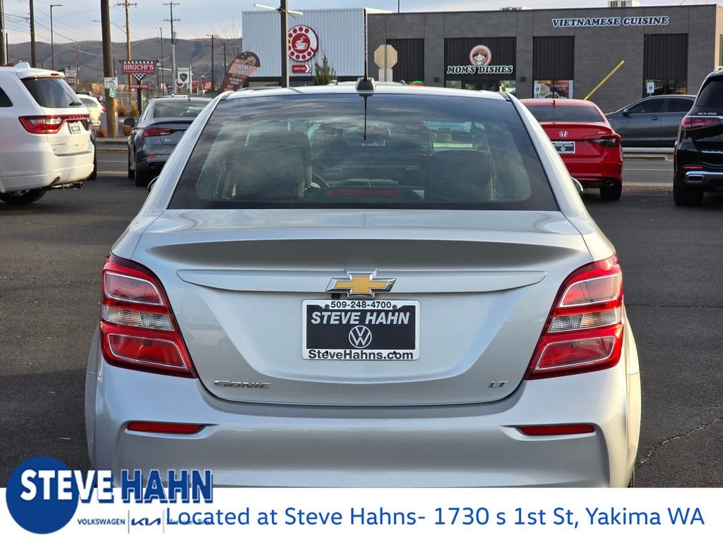 Clean CARFAX. Silver Ice Metallic 2017 Chevrolet Sonic LT ECOTEC 1.8L I4 DOHC VVT 6-Speed Automatic FWD 4D Sedan 15" Aluminum Wheels, 2 USB Ports & Auxiliary Input Jack, 2-Way Manual Front Passenger Seat Adjuster, 4-Way Manual Driver Seat Adjuster, 6 Speakers, ABS brakes, Air Conditioning, Alloy wheels, AM/FM radio: SiriusXM, Apple CarPlay/Android Auto, Brake assist, Bumpers: body-color, Delay-off headlights, Deluxe Cloth Seat Trim, Driver door bin, Driver vanity mirror, Dual front impact airbags, Dual front side impact airbags, Electronic Stability Control, Emergency communication system: OnStar Guidance, Exterior Parking Camera Rear, Front anti-roll bar, Front Bucket Seats, Front License Plate Bracket, Front reading lights, Front wheel independent suspension, Fully automatic headlights, Heated door mirrors, Illuminated entry, Knee airbag, Low tire pressure warning, Occupant sensing airbag, Outside temperature display, Overhead airbag, Panic alarm, Passenger door bin, Passenger vanity mirror, Power door mirrors, Power steering, Power windows, Preferred Equipment Group 1SD, Premium 6-Speaker Audio System Feature, Radio data system, Radio: Chevrolet MyLink AM/FM Stereo w/7" Screen, Rear side impact airbag, Rear window defroster, Remote keyless entry, Security system, SiriusXM Satellite Radio, Speed control, Split folding rear seat, Sport steering wheel, Steering wheel mounted audio controls, Tachometer, Telescoping steering wheel, Tilt steering wheel, Traction control, Trip computer, Variably intermittent wipers.