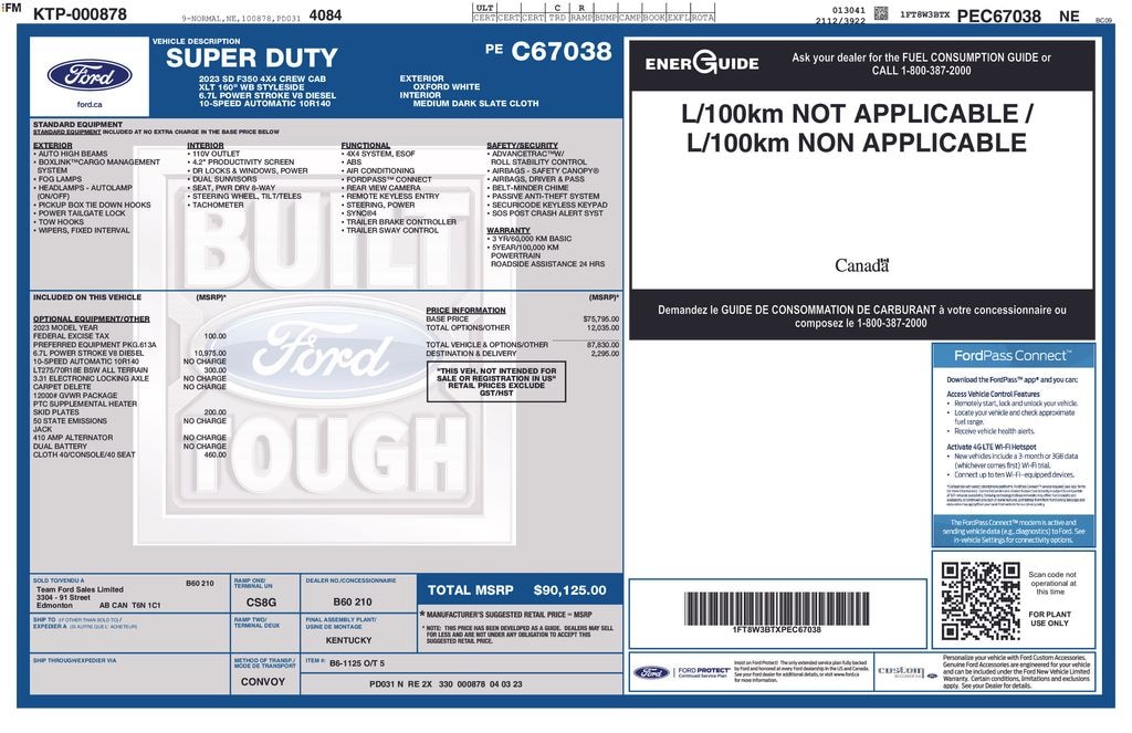 Recent Arrival! White 2023 Ford F-350SD Power Stroke 6.7L V8 DI 32V OHV Turbodiesel 10-Speed Automatic 4WD 4D Crew Cab 4WD, 4-Wheel Disc Brakes, ABS brakes, Air Conditioning, Brake assist, Compass, Delay-off headlights, Dual front impact airbags, Dual front side impact airbags, Electronic Stability Control, Electronic-Locking w/3.73 Axle Ratio, Emergency communication system: SYNC 4 911 Assist, Exterior Parking Camera Rear, Front anti-roll bar, Front reading lights, Fully automatic headlights, Heated door mirrors, Illuminated entry, Low tire pressure warning, Outside temperature display, Overhead airbag, Overhead console, Panic alarm, Passenger vanity mirror, Power door mirrors, Power steering, Power windows, Rear reading lights, Rear step bumper, Remote keyless entry, Speed control, Split folding rear seat, Steering wheel mounted audio controls, Tachometer, Telescoping steering wheel, Tilt steering wheel, Traction control, Trip computer, Turn signal indicator mirrors, Variably intermittent wipers, 4WD.