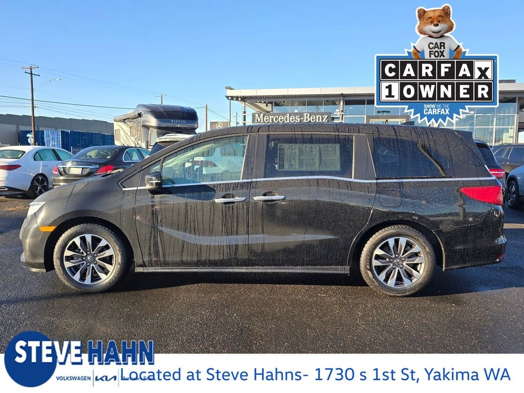 CARFAX One-Owner. Clean CARFAX. Black 2023 Honda Odyssey EX-L 3.5L V6 SOHC i-VTEC 24V 10-Speed Automatic FWD 4D Passenger Van 18" Machine-Finished Alloy Wheels, 3.61 Axle Ratio, 3rd row seats: split-bench, 4-Wheel Disc Brakes, 7 Speakers, A/V remote: CabinControl, ABS brakes, Adaptive Cruise Control: Adaptive Cruise Control (ACC) with Low-Speed Follow, Air Conditioning, Alloy wheels, AM/FM radio: SiriusXM, Anti-whiplash front head restraints, Apple CarPlay/Android Auto, Auto High-beam Headlights, Auto-dimming Rear-View mirror, Automatic temperature control, Blind Spot Information (BSI) System warning, Brake assist, Bumpers: body-color, Delay-off headlights, Driver door bin, Driver vanity mirror, Driver's Seat Mounted Armrest, Dual front impact airbags, Dual front side impact airbags, Electronic Stability Control, Exterior Parking Camera Rear, Four wheel independent suspension, Front anti-roll bar, Front Bucket Seats, Front dual zone A/C, Front fog lights, Front reading lights, Fully automatic headlights, Garage door transmitter: HomeLink, Heated door mirrors, Heated Front Bucket Seats, Heated front seats, Illuminated entry, Knee airbag, Lane departure: Lane Keeping Assist System (LKAS) active, Leather Seat Trim, Leather steering wheel, Low tire pressure warning, Memory seat, Occupant sensing airbag, Outside temperature display, Overhead airbag, Overhead console, Panic alarm, Passenger door bin, Passenger seat mounted armrest, Passenger vanity mirror, Power door mirrors, Power driver seat, Power Liftgate, Power moonroof, Power passenger seat, Power steering, Power windows, Radio data system, Radio: 160-Watt AM/FM/HD/SiriusXM Audio System, Rear air conditioning, Rear anti-roll bar, Rear reading lights, Rear seat center armrest, Rear window defroster, Rear window wiper, Reclining 3rd row seat, Remote keyless entry, Security system, Speed control, Speed-sensing steering, Speed-Sensitive Wipers, Split folding rear seat, Spoiler, Steering wheel mounted audio controls, Tachometer, Telescoping steering wheel, Tilt steering wheel, Traction control, Trip computer, Turn signal indicator mirrors, Variably intermittent wipers.