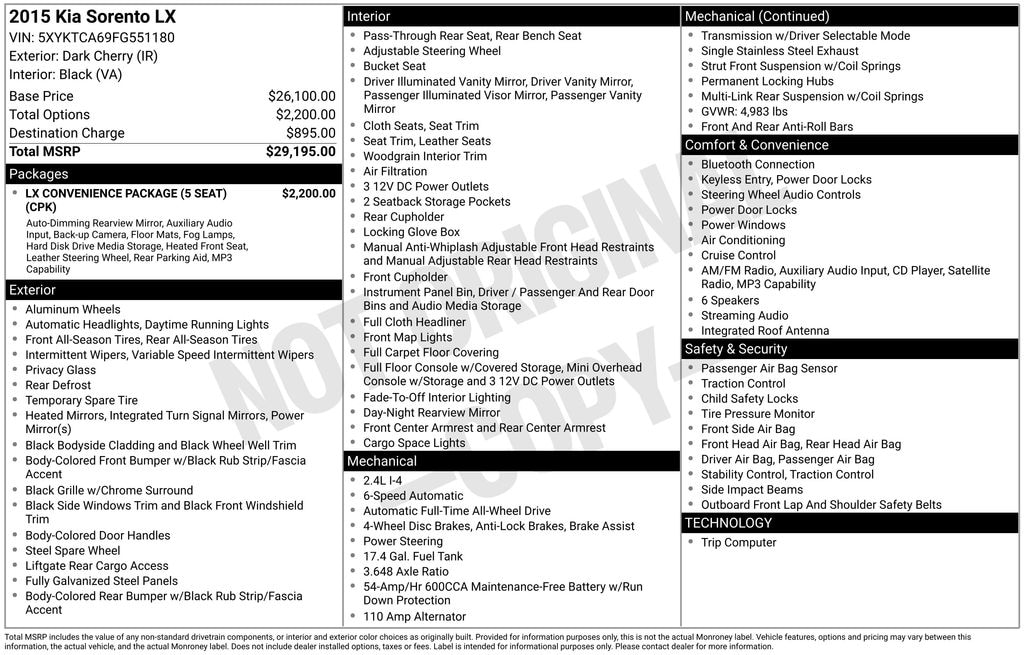 Recent Arrival! Clean CARFAX. Dark Cherry 2015 Kia Sorento LX 2.4L I4 DGI DOHC Dual CVVT 6-Speed Automatic with Sportmatic AWD 4D Sport Utility AWD, 2nd Row Sunscreen, 3.648 Axle Ratio, 4-Wheel Disc Brakes, 6 Speakers, ABS brakes, Air Conditioning, Alloy wheels, AM/FM radio: SiriusXM, AM/FM/CD/MP3 Audio System, Anti-whiplash front head restraints, Auto-Dimming Rear-View Mirror w/Compass, Backup Warning System, Brake assist, Bumpers: body-color, Carpet Floor Mats (5 Seat), CD player, Delay-off headlights, Driver door bin, Driver vanity mirror, Dual front impact airbags, Dual front side impact airbags, Electronic Stability Control, Four wheel independent suspension, Front anti-roll bar, Front Bucket Seats, Front Center Armrest, Front Fog Lamps, Front reading lights, Heated door mirrors, Heated Front Seats, Illuminated entry, Leather Wrapped Steering Wheel & Gear Shift Knob, Low tire pressure warning, LX Convenience Package (5 Seat), Occupant sensing airbag, Overhead airbag, Overhead console, Panic alarm, Passenger door bin, Passenger vanity mirror, Power door mirrors, Power steering, Power windows, Rear anti-roll bar, Rear seat center armrest, Rear window defroster, Rear window wiper, Remote keyless entry, Roof Rails, Speed control, Speed-sensing steering, Split folding rear seat, Steering wheel mounted audio controls, Tachometer, Telescoping steering wheel, Tilt steering wheel, Traction control, Tricot Fabric Seat Trim, Trip computer, Turn signal indicator mirrors, UVO Audio w/eServices & Backup Camera Display, Variably intermittent wipers, Wheels: 17" x 7.0 Silver Painted Alloy, AWD.