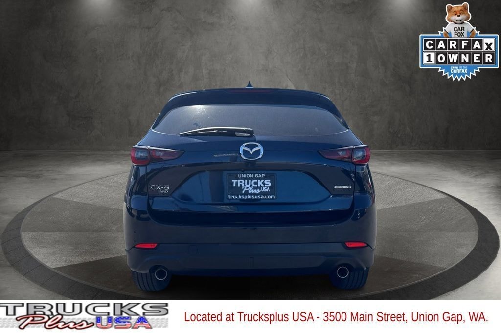 CARFAX One-Owner. Clean CARFAX. Deep Crystal Blue Mica 2023 Mazda CX-5 2.5 S Premium Package SKYACTIV® 2.5L 4-Cylinder DOHC 16V 6-Speed Automatic AWD 4D Sport Utility 10 Speakers, 4-Wheel Disc Brakes, 4.624 Axle Ratio, ABS brakes, Air Conditioning, Alloy wheels, AM/FM radio: SiriusXM, AppLink/Apple CarPlay and Android Auto, Auto High-beam Headlights, Auto-dimming Rear-View mirror, Automatic temperature control, Brake assist, Bumpers: body-color, Delay-off headlights, Driver door bin, Driver vanity mirror, Dual front impact airbags, Dual front side impact airbags, E911 Automatic Emergency Notification, Electronic Stability Control, Emergency communication system: MAZDA CONNECT, Exterior Parking Camera Rear, Four wheel independent suspension, Front anti-roll bar, Front Bucket Seats, Front Center Armrest w/Storage, Front dual zone A/C, Front reading lights, Fully automatic headlights, Garage door transmitter: HomeLink, Heated door mirrors, Heated Front Bucket Seats, Heated front seats, Illuminated entry, Infotainment System Voice Command, Leather Seat Trim, Leather Shift Knob, Low tire pressure warning, Memory seat, Multifunction Commander Control, Occupant sensing airbag, Outside temperature display, Overhead airbag, Overhead console, Pandora, Panic alarm, Passenger door bin, Passenger vanity mirror, Power door mirrors, Power driver seat, Power Liftgate, Power moonroof, Power passenger seat, Power steering, Power windows, Radio Broadcast Data System Program Information, Radio data system, Radio: AM/FM/HD Audio System, Rain sensing wipers, Rear anti-roll bar, Rear Bumper Guard, Rear reading lights, Rear seat center armrest, Rear window defroster, Rear window wiper, Remote keyless entry, SMS Text Msg Audio Delivery & Reply, Speed control, Speed-sensing steering, Split folding rear seat, Spoiler, Steering wheel mounted audio controls, Tachometer, Telescoping steering wheel, Tilt steering wheel, Traction control, Trip computer, Turn signal indicator mirrors, Variably intermittent wipers, Wheels: 19" x 7J Aluminum Alloy.