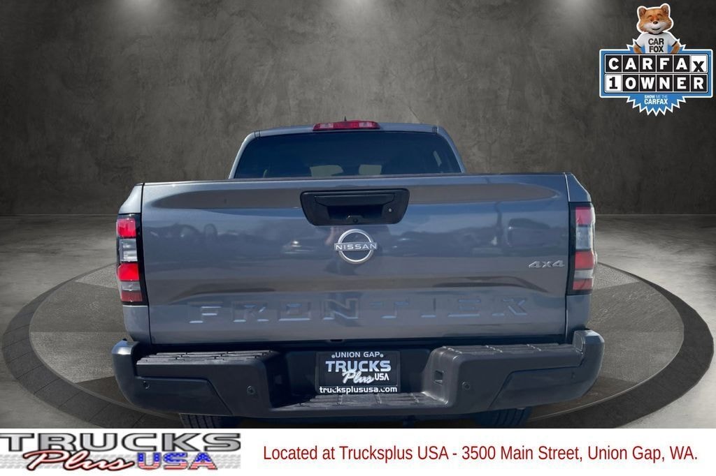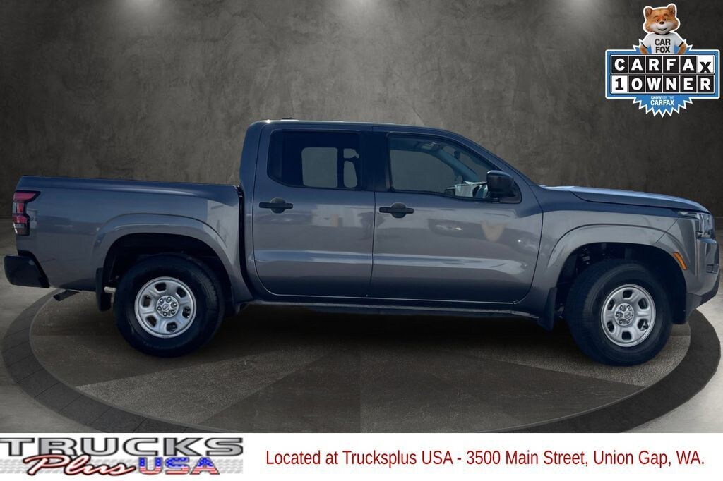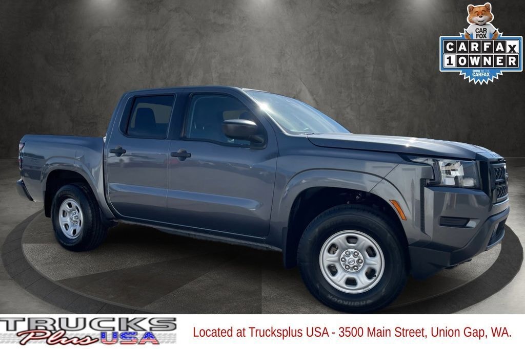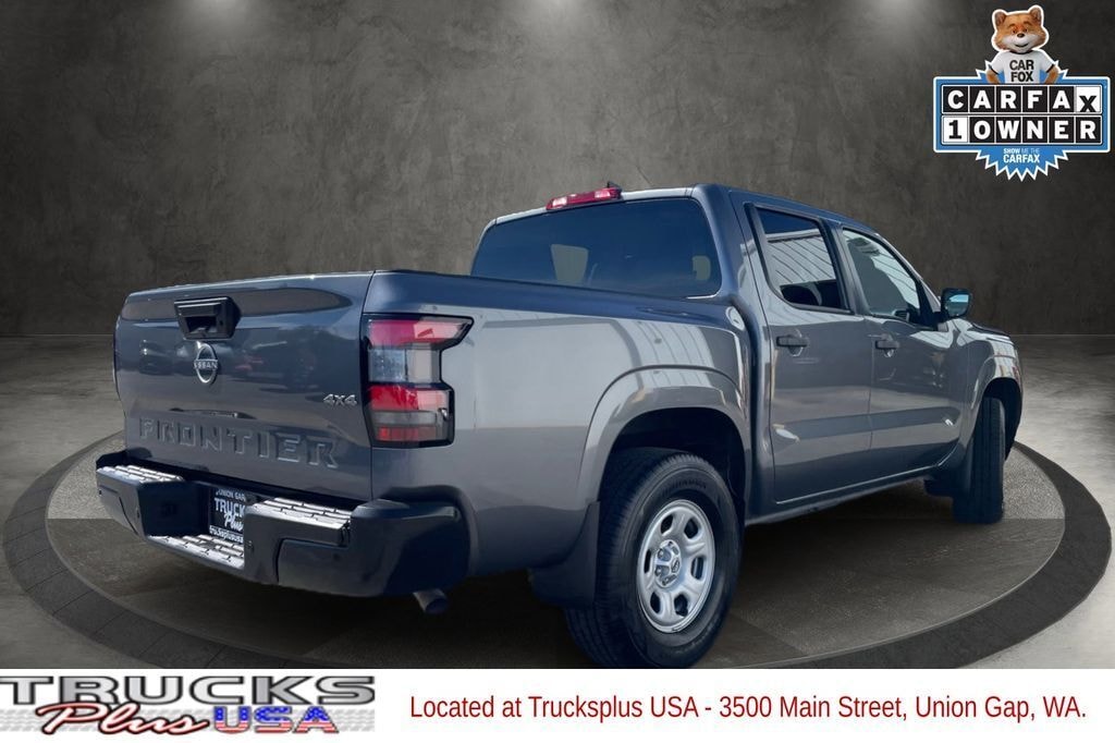 CARFAX One-Owner. Gun Metallic 2023 Nissan Frontier S 3.8L DI DOHC 24V V6 9-Speed Automatic 4WD 4D Crew Cab Frontier S, 4D Crew Cab, 4WD, Gun Metallic, 16" Styled Steel Wheels, 3.692 Axle Ratio, 4 Speakers, 4-Wheel Disc Brakes, ABS brakes, Air Conditioning, AM/FM radio: SiriusXM, Anti-whiplash front head restraints, Apple CarPlay/Android Auto, Blind Spot Warning, Brake assist, Bumpers: body-color, Carpeted Floor Mats, Cloth Seat Trim, Delay-off headlights, Driver door bin, Dual front impact airbags, Dual front side impact airbags, Electronic Stability Control, Front anti-roll bar, Front Bucket Seats, Front Center Armrest, Front reading lights, Front wheel independent suspension, Fully automatic headlights, High Beam Assist (HBA), Illuminated entry, Intelligent Cruise Control, Knee airbag, Lane Departure Warning System, Low tire pressure warning, Occupant sensing airbag, Overhead airbag, Panic alarm, Passenger door bin, Power steering, Power windows, Radio data system, Radio: SXM/AM/FM/AUX/USB Audio System w/4 Speakers, Rear anti-roll bar, Rear Automatic Braking (RAB), Rear Cross Traffic Alert (RCTA), Rear Sonar System, Rear step bumper, Remote keyless entry, Speed control, Speed-sensing steering, Splash Guards, Split folding rear seat, Steering wheel mounted audio controls, Tachometer, Technology Package, Tilt steering wheel, Traction control, Trip computer, Variably intermittent wipers, Frontier S, 4D Crew Cab, 4WD, Gun Metallic.
