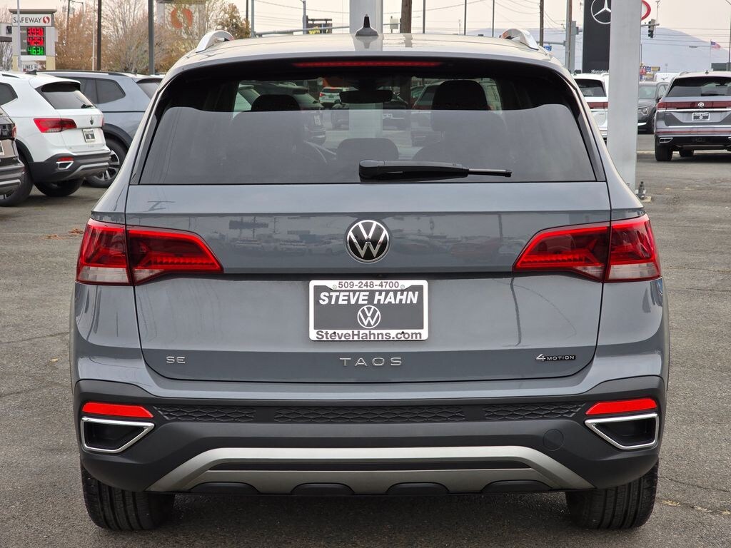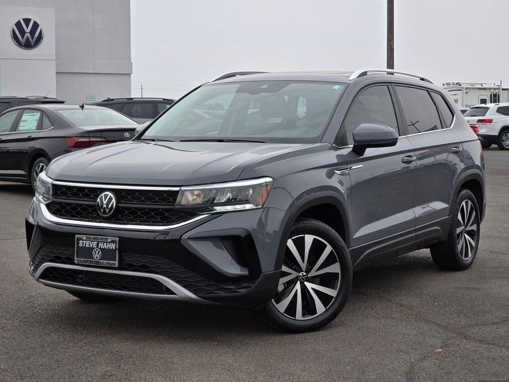 Recent Arrival! Clean CARFAX. Gray 2023 Volkswagen Taos 1.5T SE 1.5L I4 Turbocharged DOHC 16V LEV3-SULEV30 158hp 7-Speed DSG Automatic with Tiptronic AWD 4D Sport Utility 4-Wheel Disc Brakes, 5.20 Axle Ratio, 6 Speakers, ABS brakes, Active Blind Spot Monitor, Air Conditioning, Alloy wheels, AM/FM radio: SiriusXM with 360L, Auto High-beam Headlights, Brake assist, Bumpers: body-color, CloudTex & Cloth Seating Surfaces, Compass, Delay-off headlights, Driver door bin, Driver vanity mirror, Dual front impact airbags, Dual front side impact airbags, Electronic Stability Control, Emergency communication system: VW Car-Net Safe & Secure 5-year, Exterior Parking Camera Rear, Four wheel independent suspension, Front anti-roll bar, Front Bucket Seats, Front Center Armrest, Front reading lights, Front Strut Rear Multi-Link Suspension, Fully automatic headlights, Heated door mirrors, Heated Front Comfort Seats, Heated front seats, Heated steering wheel, Illuminated entry, Leather Shift Knob, Low tire pressure warning, Occupant sensing airbag, Outside temperature display, Overhead airbag, Overhead console, Panic alarm, Passenger door bin, Passenger vanity mirror, Power door mirrors, Power driver seat, Power steering, Power windows, Radio data system, Radio: MIB3 Composition Media AM/FM/HD, Rain sensing wipers, Rear anti-roll bar, Rear seat center armrest, Rear window defroster, Rear window wiper, Remote keyless entry, Security system, Speed control, Speed-sensing steering, Split folding rear seat, Spoiler, Steering wheel mounted audio controls, Tachometer, Telescoping steering wheel, Tilt steering wheel, Traction control, Trip computer, Variably intermittent wipers, Wheels: 18" 2-Tone Machined Alloy.